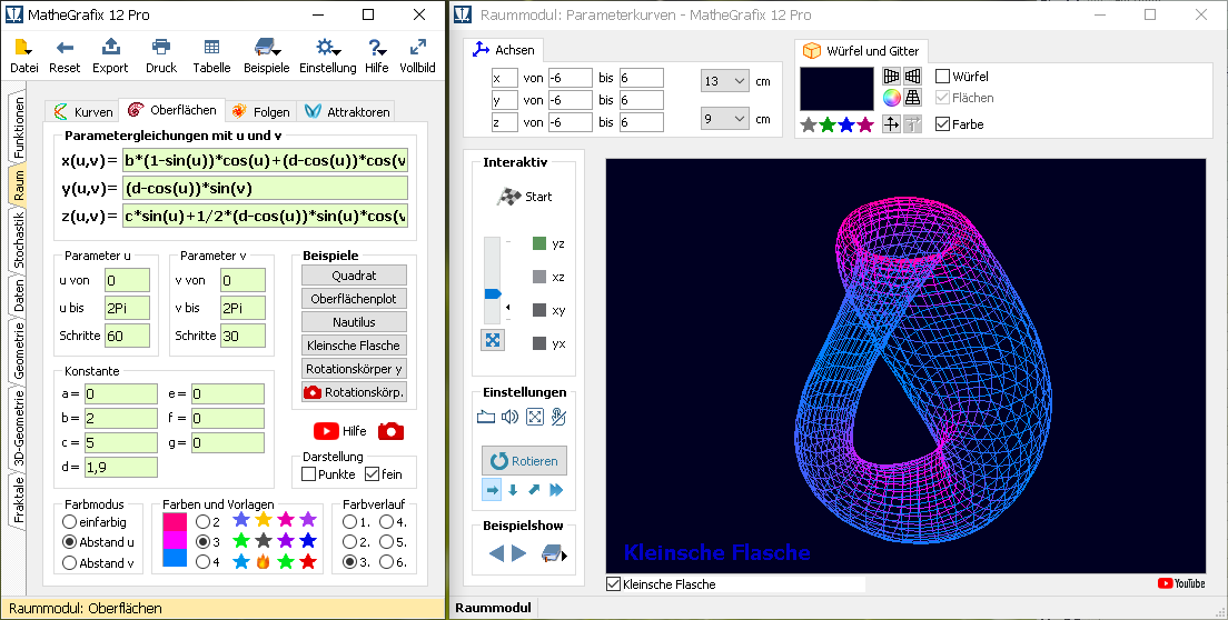 Im Raummodul werden Linien und Oberflächen in Parameterdarstellung im dreidimensionalen Raum gezeigt. Seltsame Attraktoren (z.B. der Lorenz-Attraktor) lassen sich frei im Raum drehen.