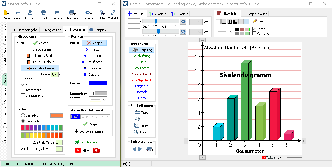Die Screenshots zeigen eine Auswahl aus den Themenfenstern der einzelnen Module. Der Schwerpunkt liegt auf der überarbeiteten Benutzeroberfläche von MatheGrafix 12. Einige Fenster stehen nur in der Pro-Version zur Verfügung.
