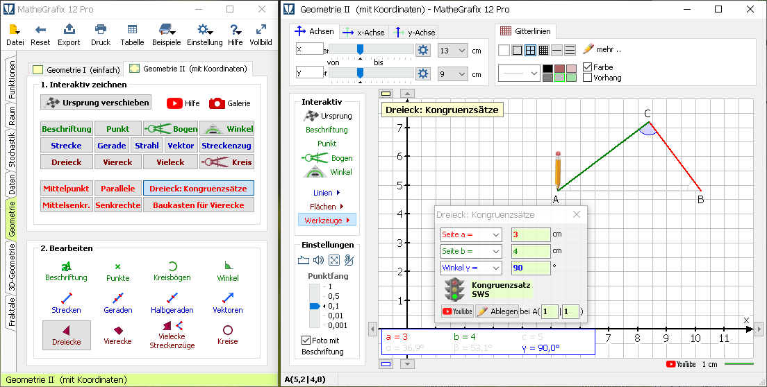 Im Modul Geometrie kommt man von Punkten, Linien, Winkeln, Vielecken, Kreisen bis zu Kongruenzsätzen für Dreiecke. Mit dem Baukasten für Vierecke erhält man sämtliche Vierecke vom Quadrat bis zum Drachenviereck.