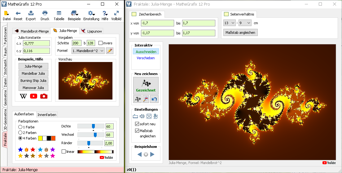 Im Modul Fraktale findet man in der Zahlenebene Mandelbrotmengen, Juliamengen und Ljapunowdiagramme. Man kann eigene Formeln (nur Pro-Version) verwenden und die Bilder in Postergröße exportieren.